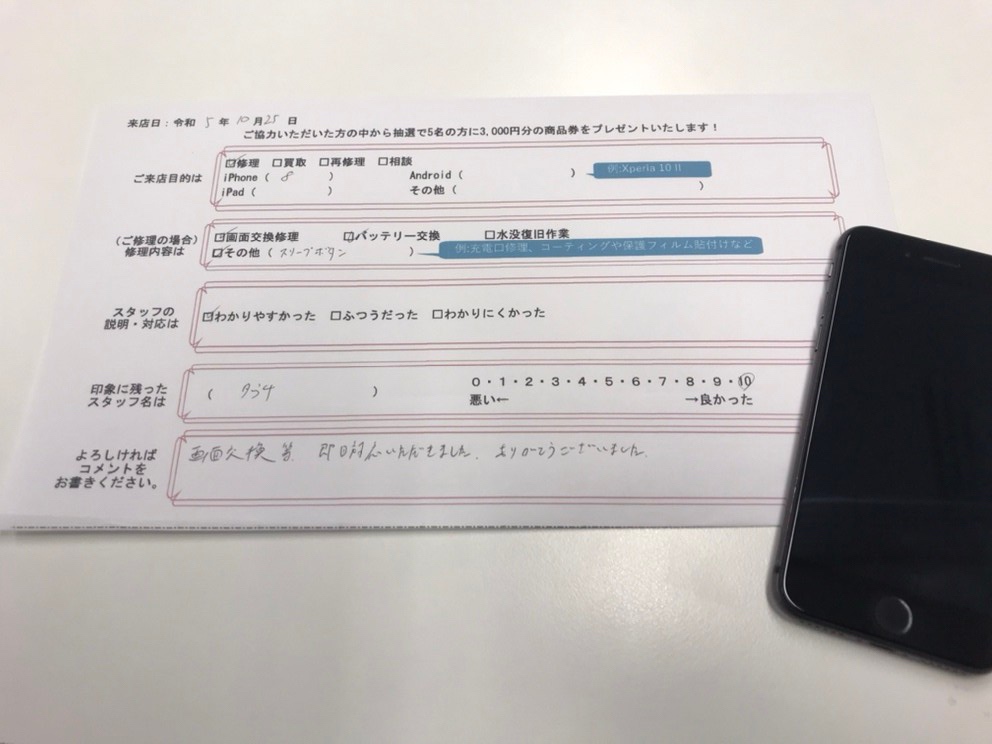 画面交換など、即日対応していただきました。 ありがとうございました。