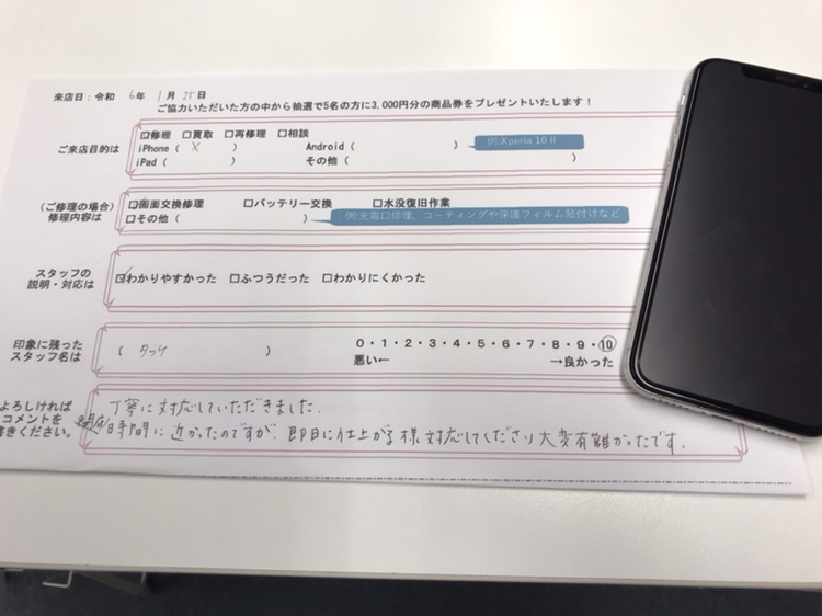 閉店時間に近かったのですが、即日に仕上がるように対応してくださり大変ありがたかったです。