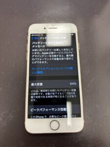 このように修理前は画面が割れており、バッテリーの最大容量も64%とかなり消耗しています。