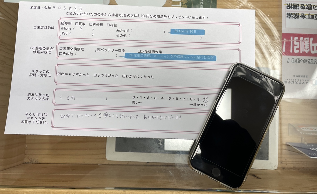スマホスピタル京都河原町 2023/6/3 iPhone7のバッテリー交換をしました!