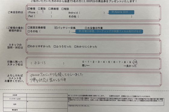 【お客様の声】iPhone7のバッテリーを交換させていただきました!