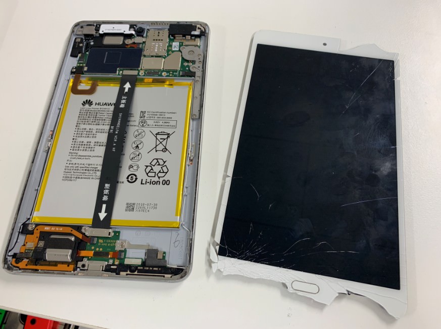 dtab Compact(d-02K)の表面ガラスが粉々に割れた!縁が欠けて本体内部がむき出しの状態も画面交換修理で元通り![町田のタブレット修理店]