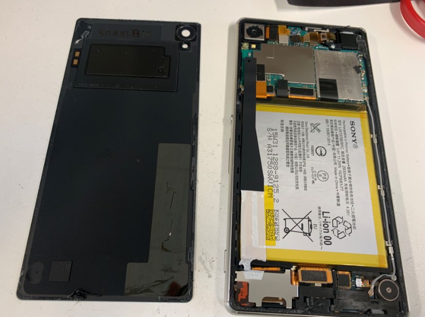 XperiaZ4(SO-03G)はこうやって背面ガラスを剥がして分解するのですが、ガラス製なので割れやすいのと強い粘着が付いているので剥がすのに苦労します。