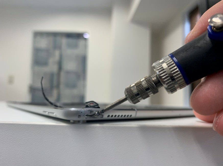 iPadPro10.5のスリープボタンをぶつけてしまって本体内に陥没してしまい、ずっと押されっぱなしになってしまったと修理のご相談を頂きました。