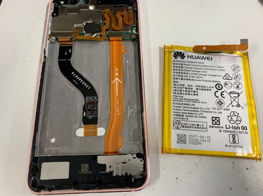 HUAWEI P10liteの電池劣化が進み、1日も充電が持たなくなってしまったと内蔵電池パック交換修理作業のご依頼を頂きました。