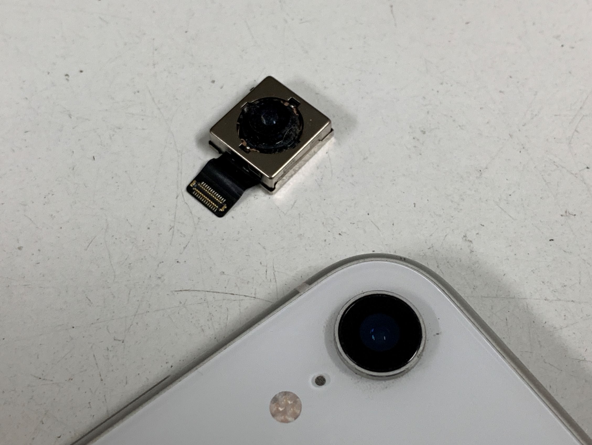 iPhoneXRのカメラレンズ割れを放置していると、カメラ内にゴミが入って白く濁るようになってしまったのと、カメラからジジジという異音が聞こえるようになってしまったと修理ご依頼を頂きました。