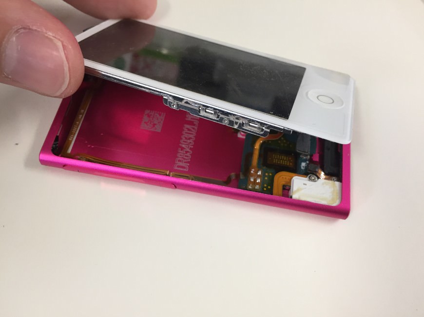 iPod nano 第7世代を分解するにはこのように画面側からガラスを剥がさないといけません。