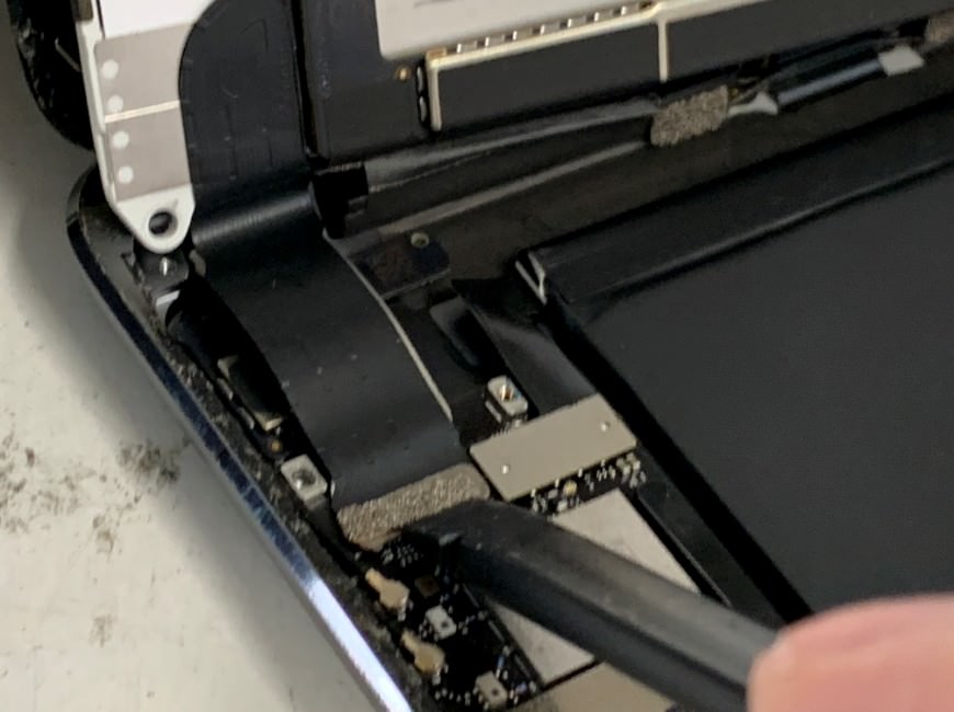 プラスチック製のヘラを使って液晶画面のコネクタを外します。