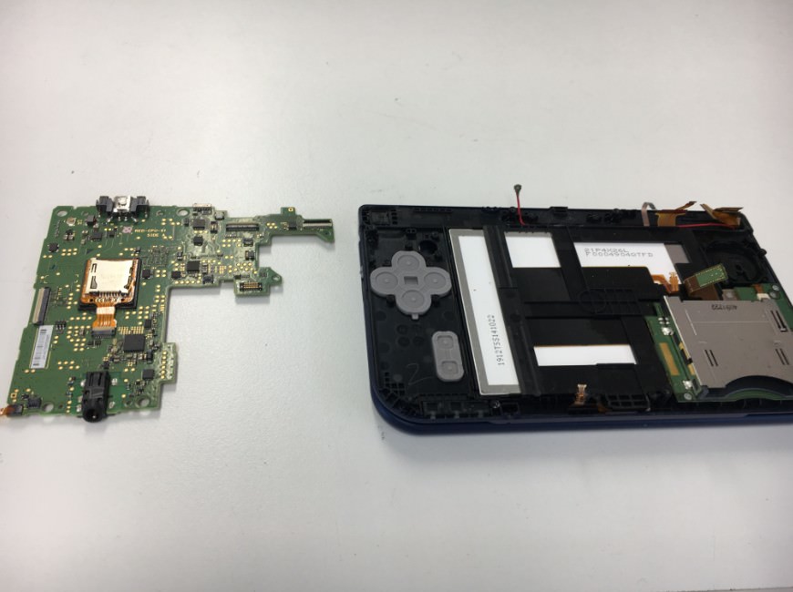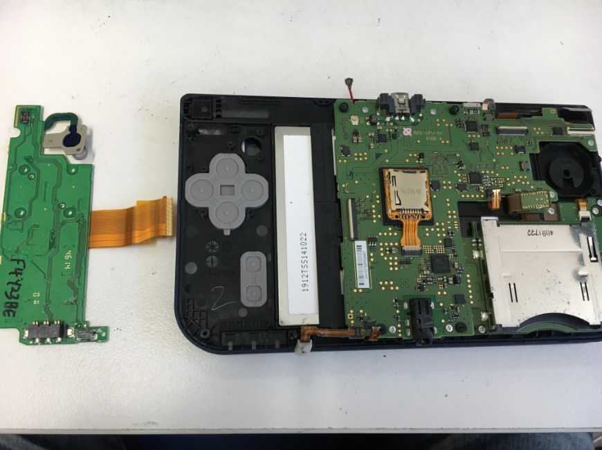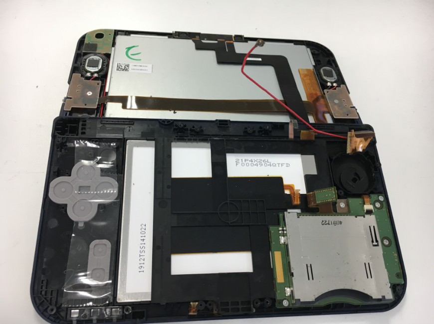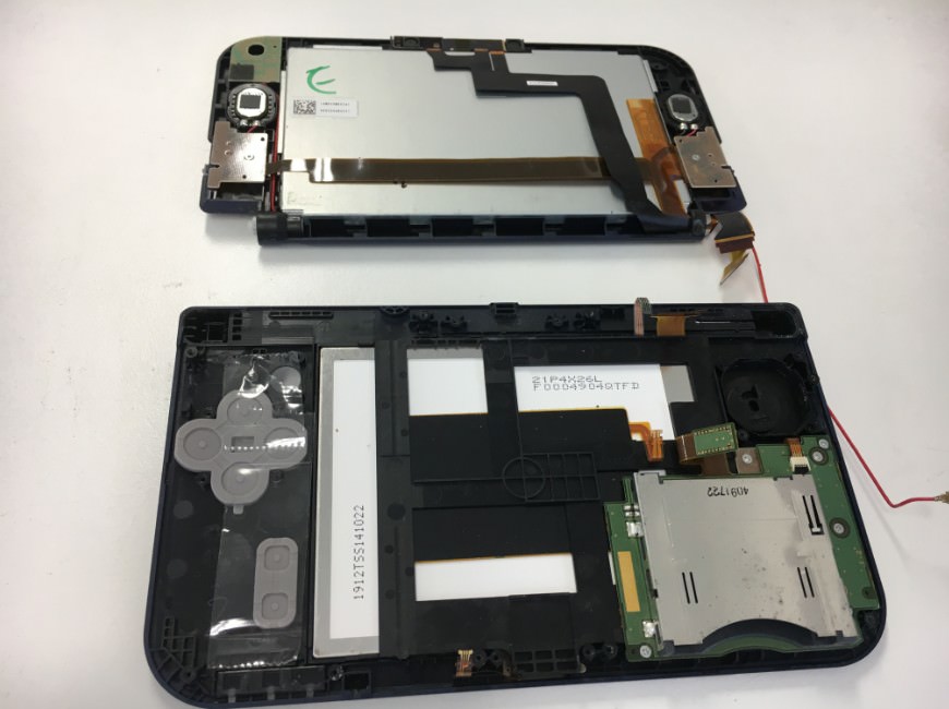 New3DSLLの上液晶、カメラ、スピーカーケーブルはこのように本体をバラバラにしないといけないので修理難易度が非常に高いです。