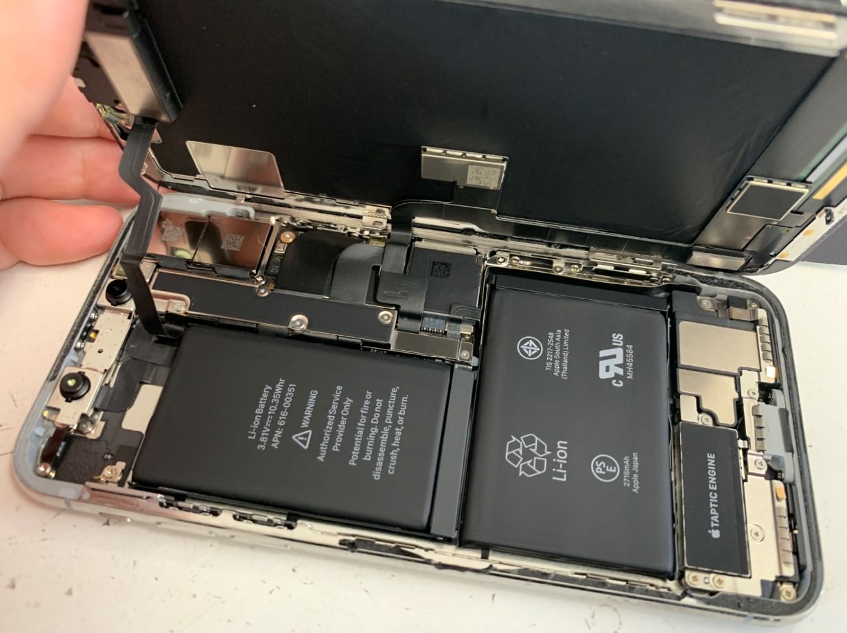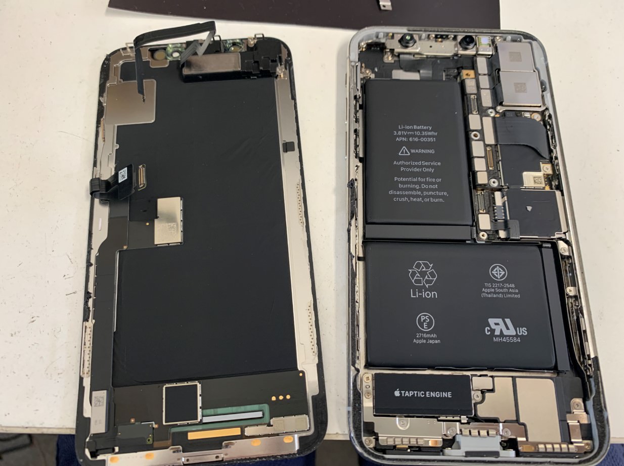 iPhoneXは横開きで、かつ画面パーツから本体にケーブルが伸びてきています。