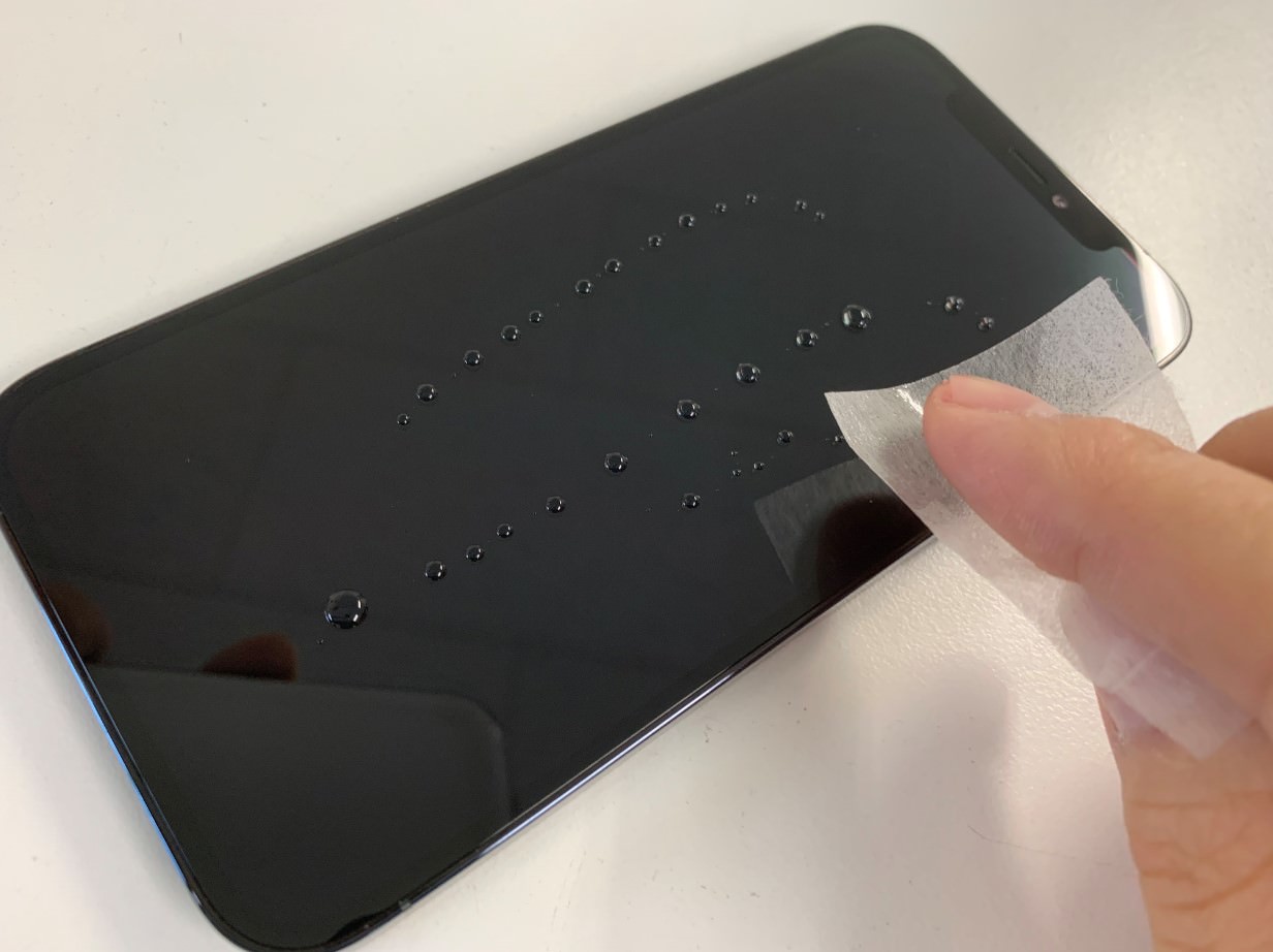 画面の縁やスピーカー部分から内部にコーティング剤が入らないように注意しながら画面になじませていきます。