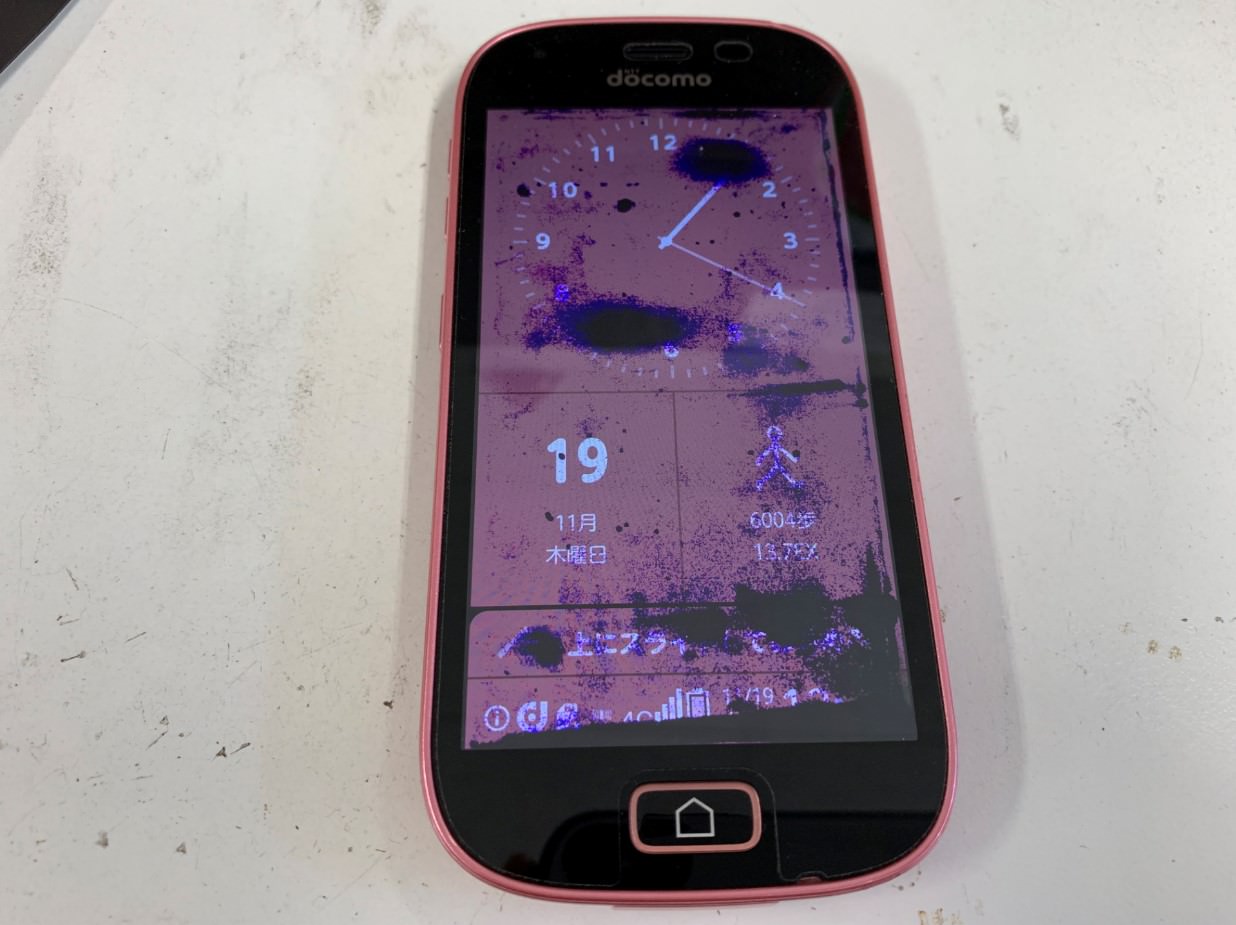 らくらくスマートフォン me(F-03K)液漏れで変色!?画面交換修理で直ります!