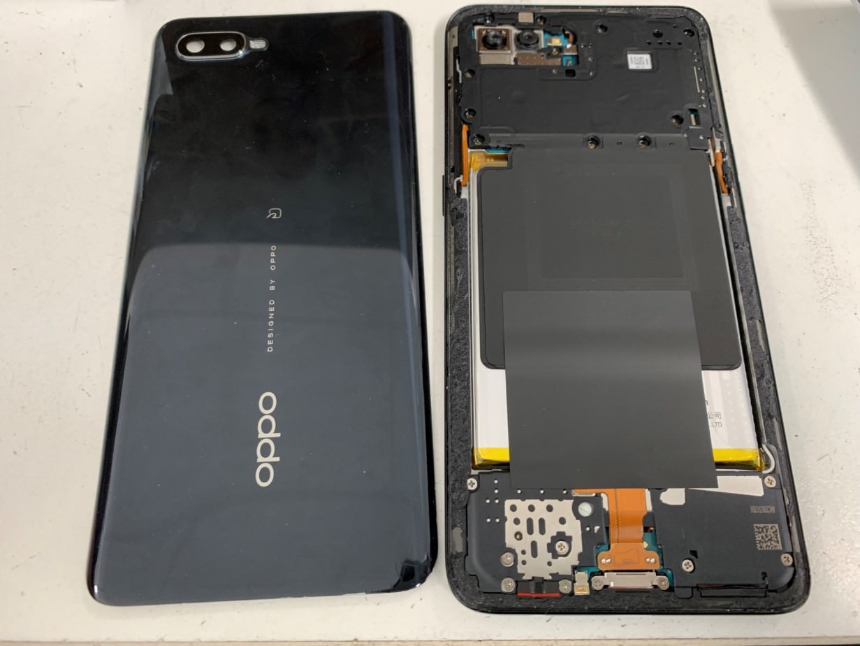 OPPO Reno Aの場合、まずは背面パネルを剥がします。