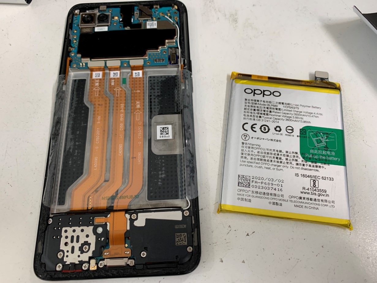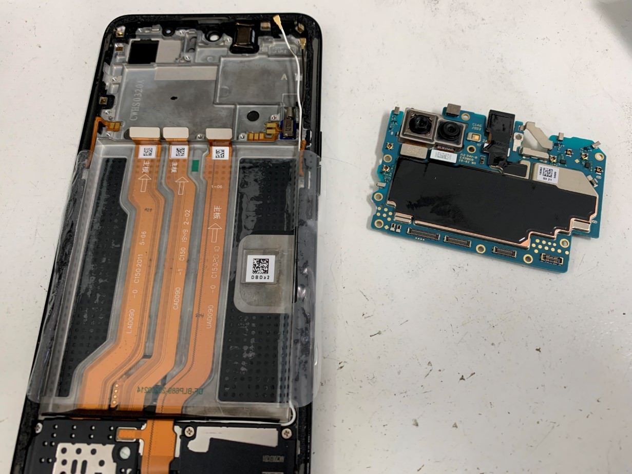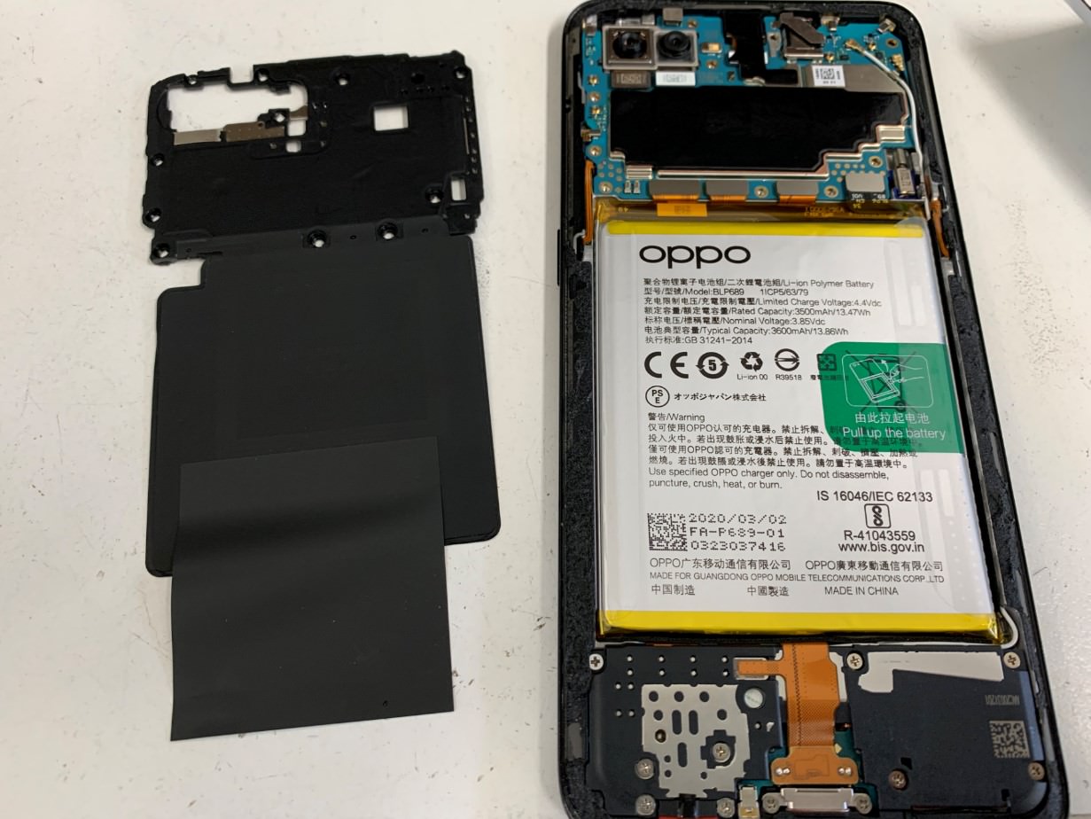 OPPO Reno Aの場合、取り出した基板とバッテリーを別の画面パーツへ移植します。