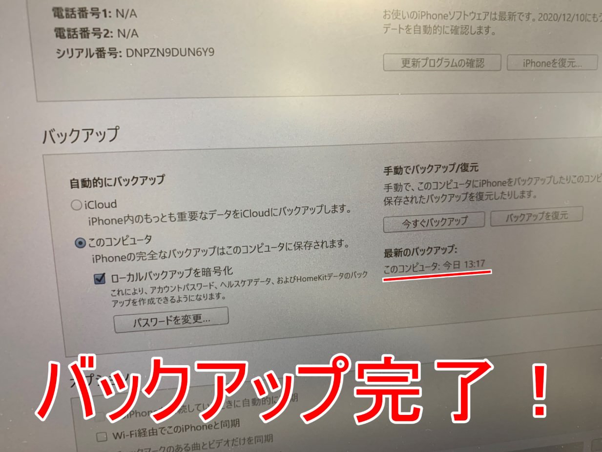 内容量にもよりますが、iTunesでのデータバックアップは大体30分~2時間程度で終わります。