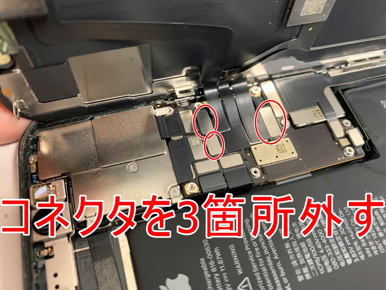 画面パーツのコネクタ2つとFaceIDセンサーのコネクタ1つ、合計3つのコネクタを全て外します。