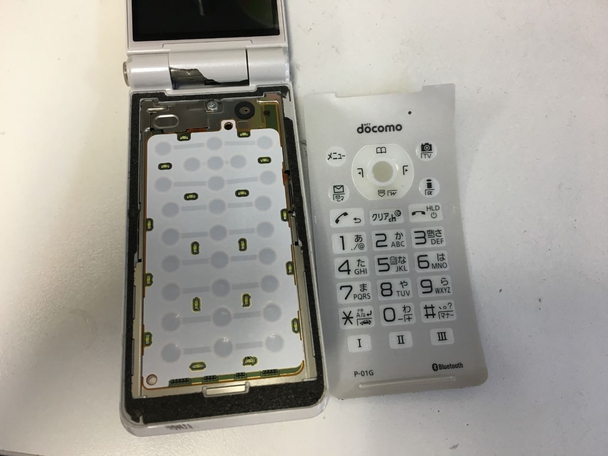 ガラケー(P-01G)の中央部分のフレームが割れてしまい、内部のケーブルを痛めてしまったのか画面に何も表示されなくなってしまったと修理依頼を頂きました。