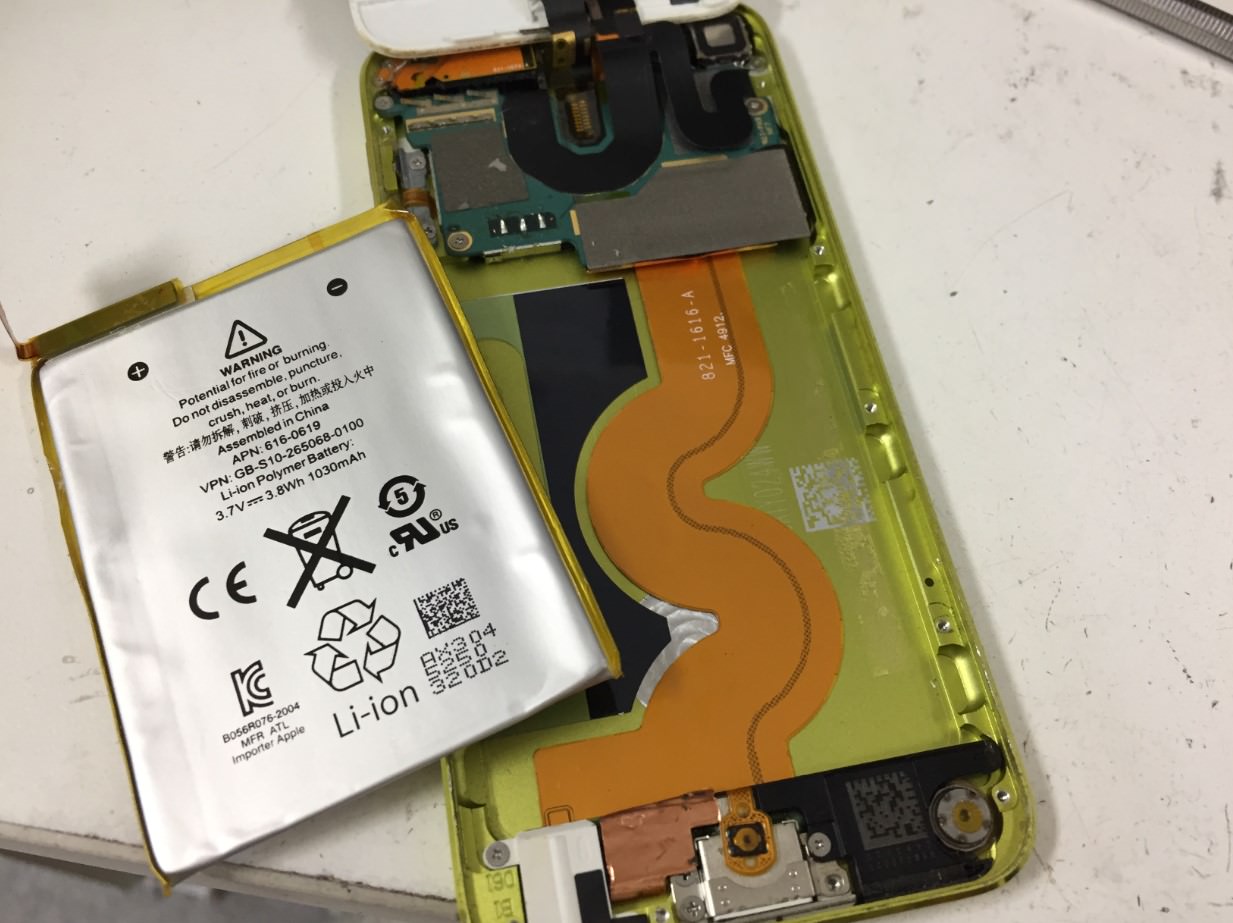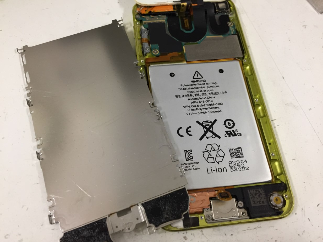 iPod Touch第5世代は電池交換の際にはんだ小手を使わないといけないので、修理難易度が若干高いです。