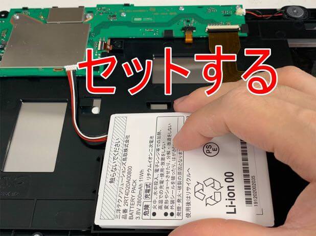壊れた本体から基板と共に取り外したバッテリーを本体フレームへとセットし…