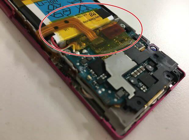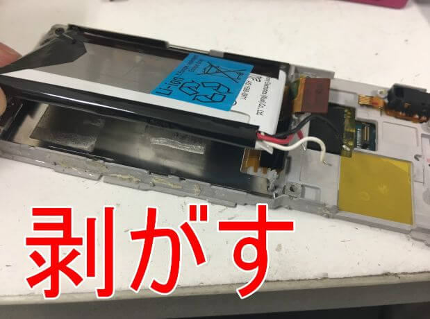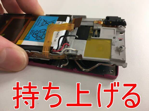 絶縁テープを剥がすことで、液晶画面やボリュームボタンケーブルやバッテリーコネクタが露になります。