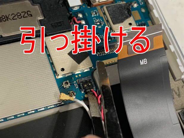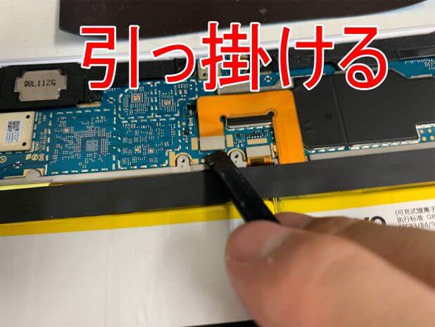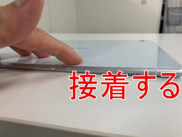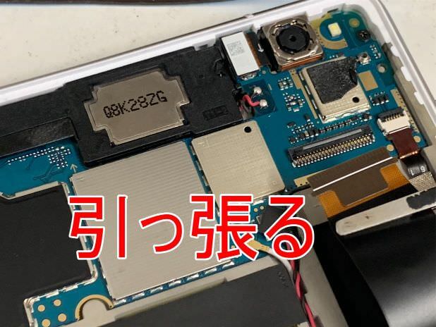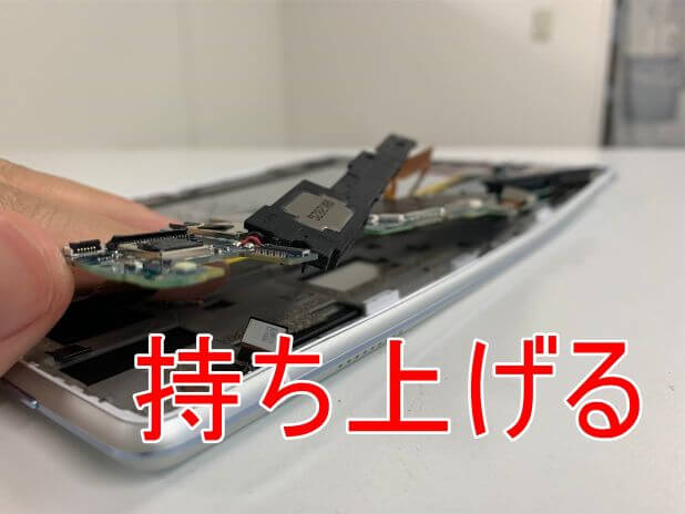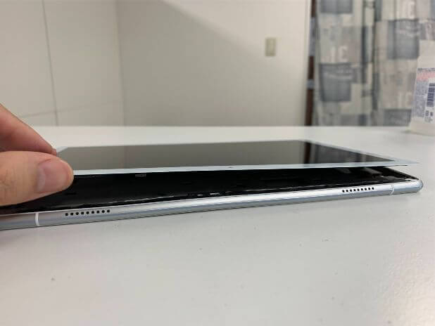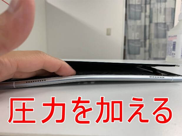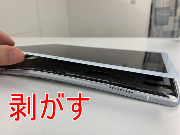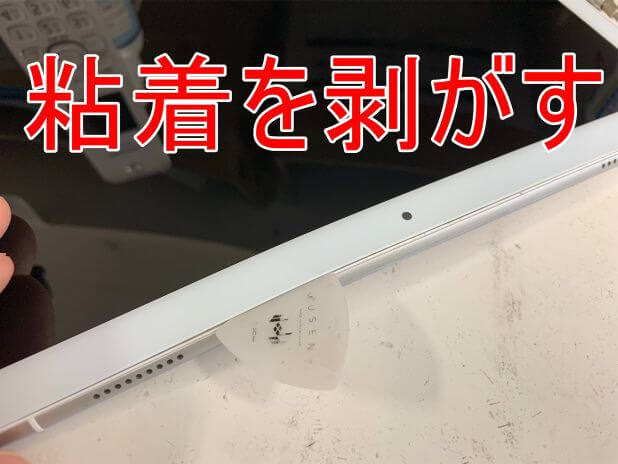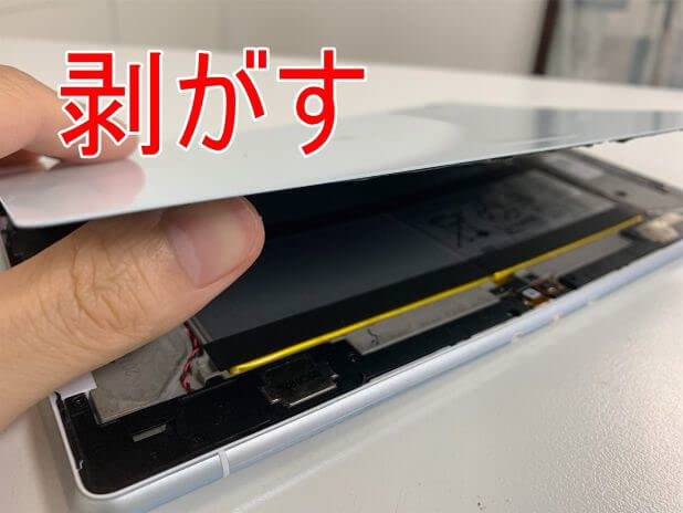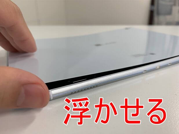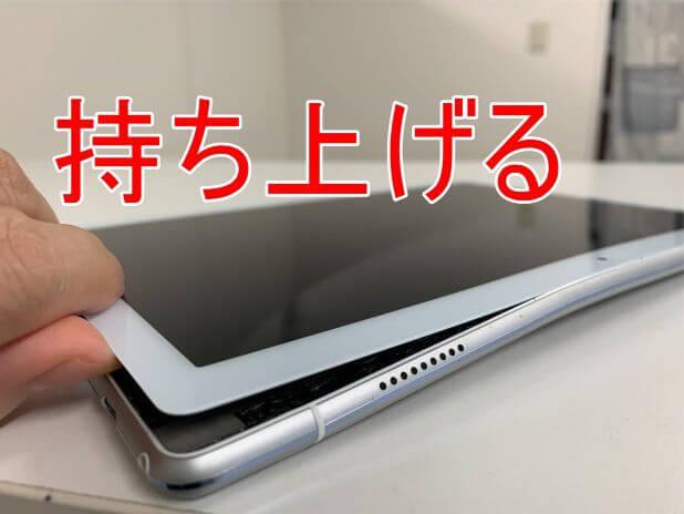 粘着が残っている状態で無理に持ち上げると背面パネルが割れてしまうので注意します。