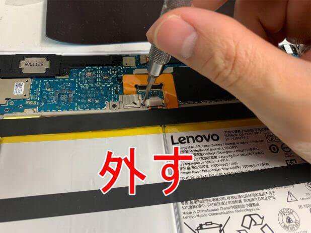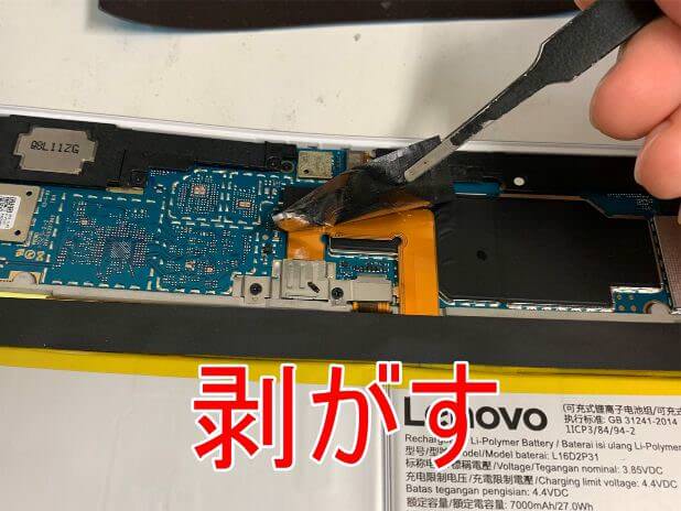 粘着テープは割と強力なので、剥がす際にバッテリーのケーブルが裂けてしまわないよう注意が必要です。