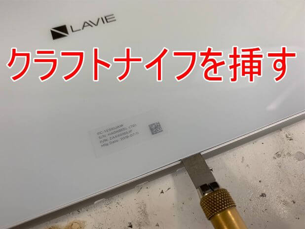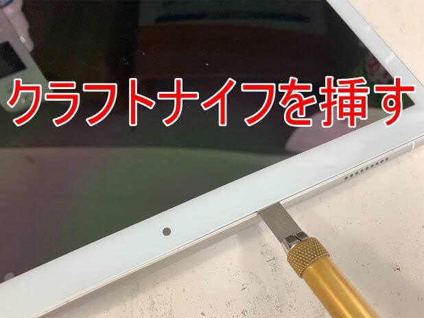 クラフトナイフを挿して、ガラスと本体の間に隙間を作ります。