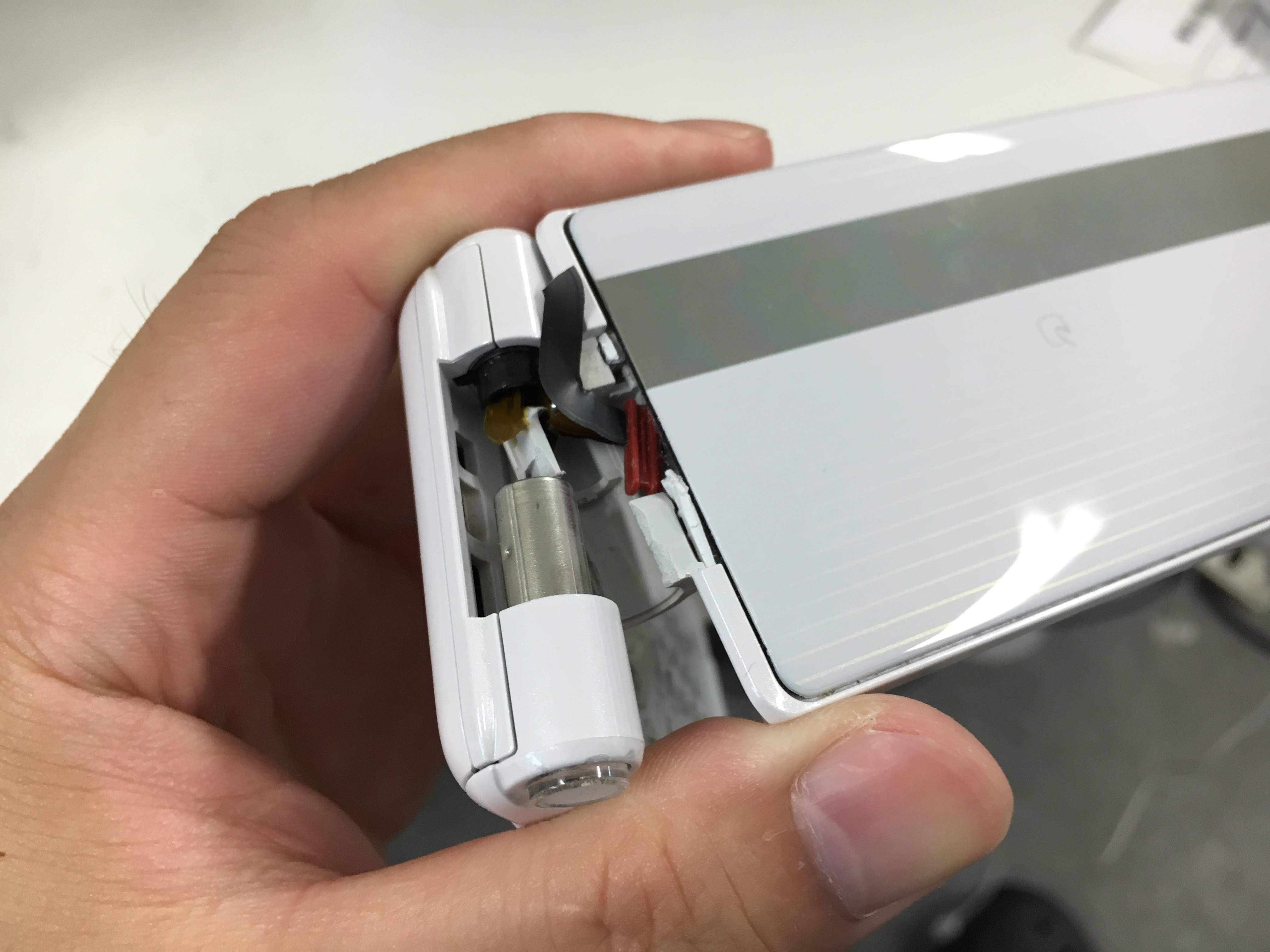 俗にいう「逆パカ」によってフレームが割れて、液晶のケーブルが断線してしまっています。