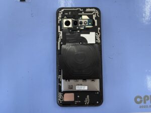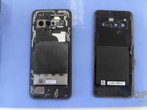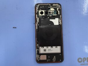 続いて、ワイヤレス充電からアウトカメラを囲んでいるフレームのネジを外し、本体上部のフレームを外します。