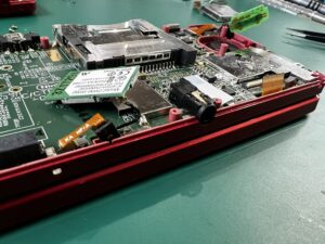 新品の液晶パーツを下側の画面ポケットに埋め込み、基板を固定してケーブルを接続していきます。