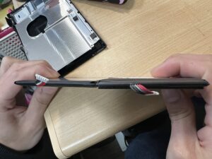 キックスタンドも欠けてしまっていますね。ひとまず本体外部のビスをすべて摘出します。
