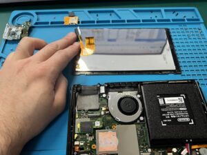 新品の液晶をタッチパネルに重ね、仮付け点検していきましょう!