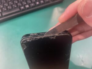 iPhone 13は液晶開けで配線を断線させないように、小さな隙間を作りピックをスライドするように丁寧に開いていきます。