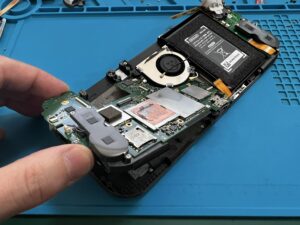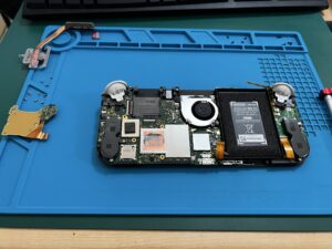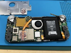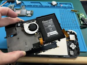 まだまだ分解します!ほぼ同じ手順で右側のボタン基板も摘出するとファン/バッテリーが載ったフレームが持ち上がります。