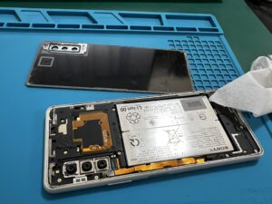 Xperia10Ⅱはどのみちリアパネルから基板にアクセスするので、過去の粘着を綺麗に撤去しバンパーを外します。