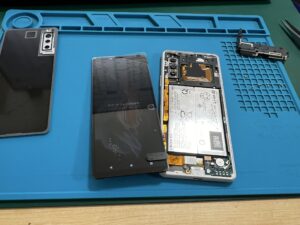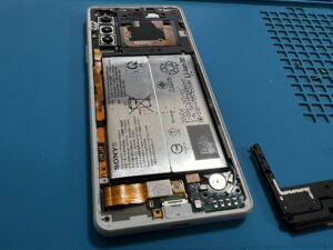 落下衝撃により液晶が破損し、リアパネルまで剥がれ落ちてしまったXperia10Ⅱの修理