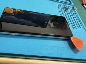 ヒートマットで加熱処理し、隙間を広げるように画面とフレームの間にピックを差していきます。
