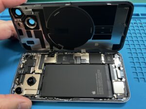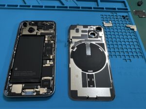 iPhone14は同シリーズのProなどと違い、リアパネルから基板にアクセスします。