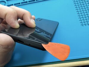 リアパネル側をヒートマットで加熱処理し、粘着が緩んだらオープニングピックで隙間を広げていきます。