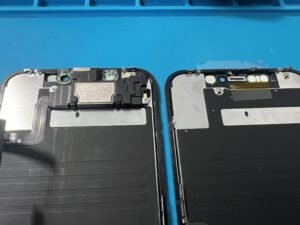 ↑左側の旧パネルに取り付けられているこのアッセンブリパーツ、イヤースピーカー/調光・感光・FaceID等ぎゅっと詰まったセンサーです。