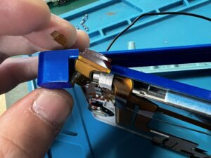 ヒンジの内部には複雑にカールされたフレキケーブルが複数本通っており、抜き取り/分離は最大の難所といえるでしょう。
