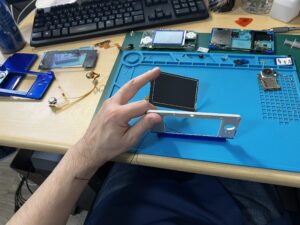 破損を招かない程度にヒートガンなどで加熱処理、上液晶の粘着を緩めて保護ガラスパネルを摘出します。