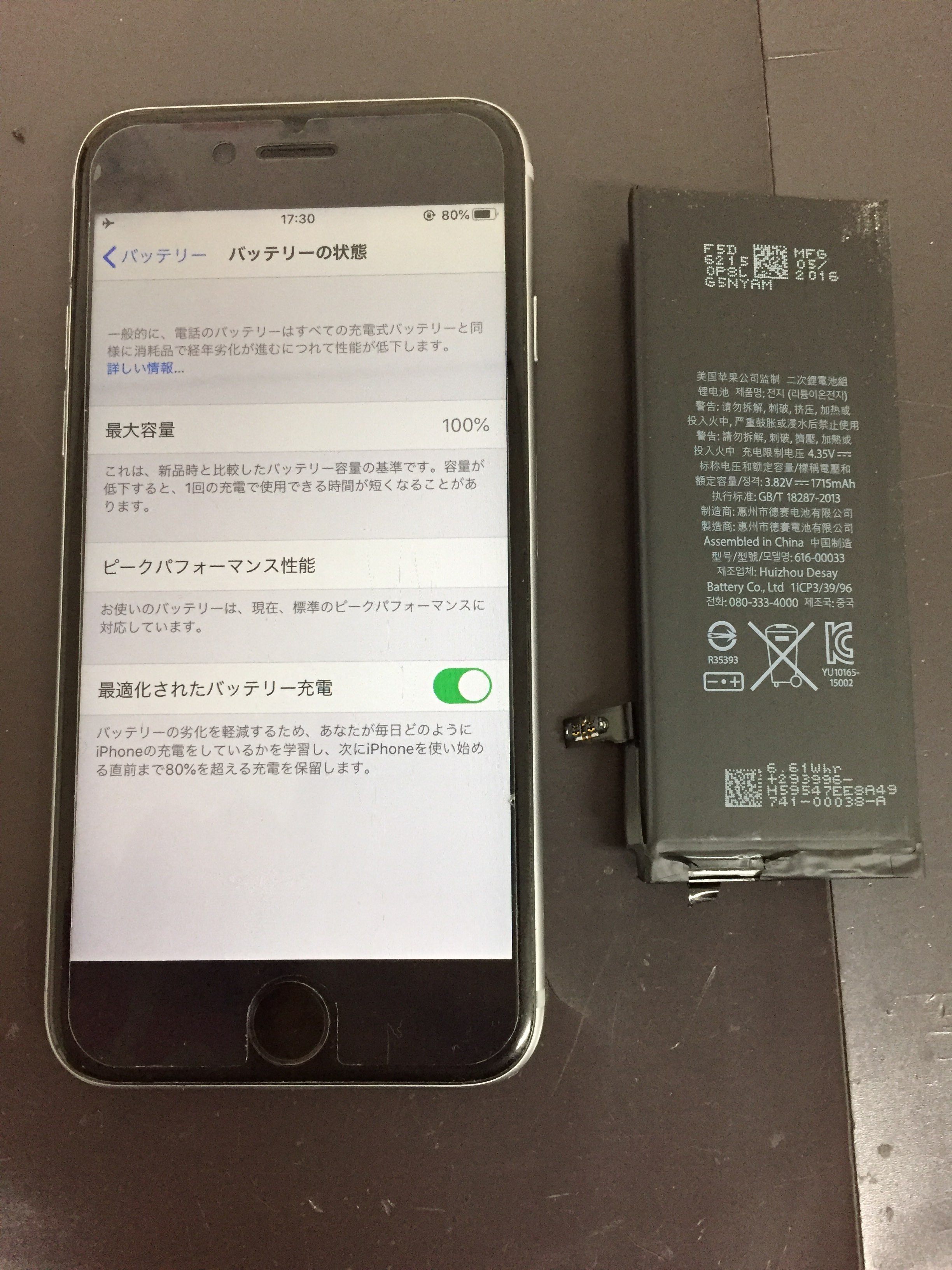 バッテリー交換修理後は最大用量が100%まで回復しております。