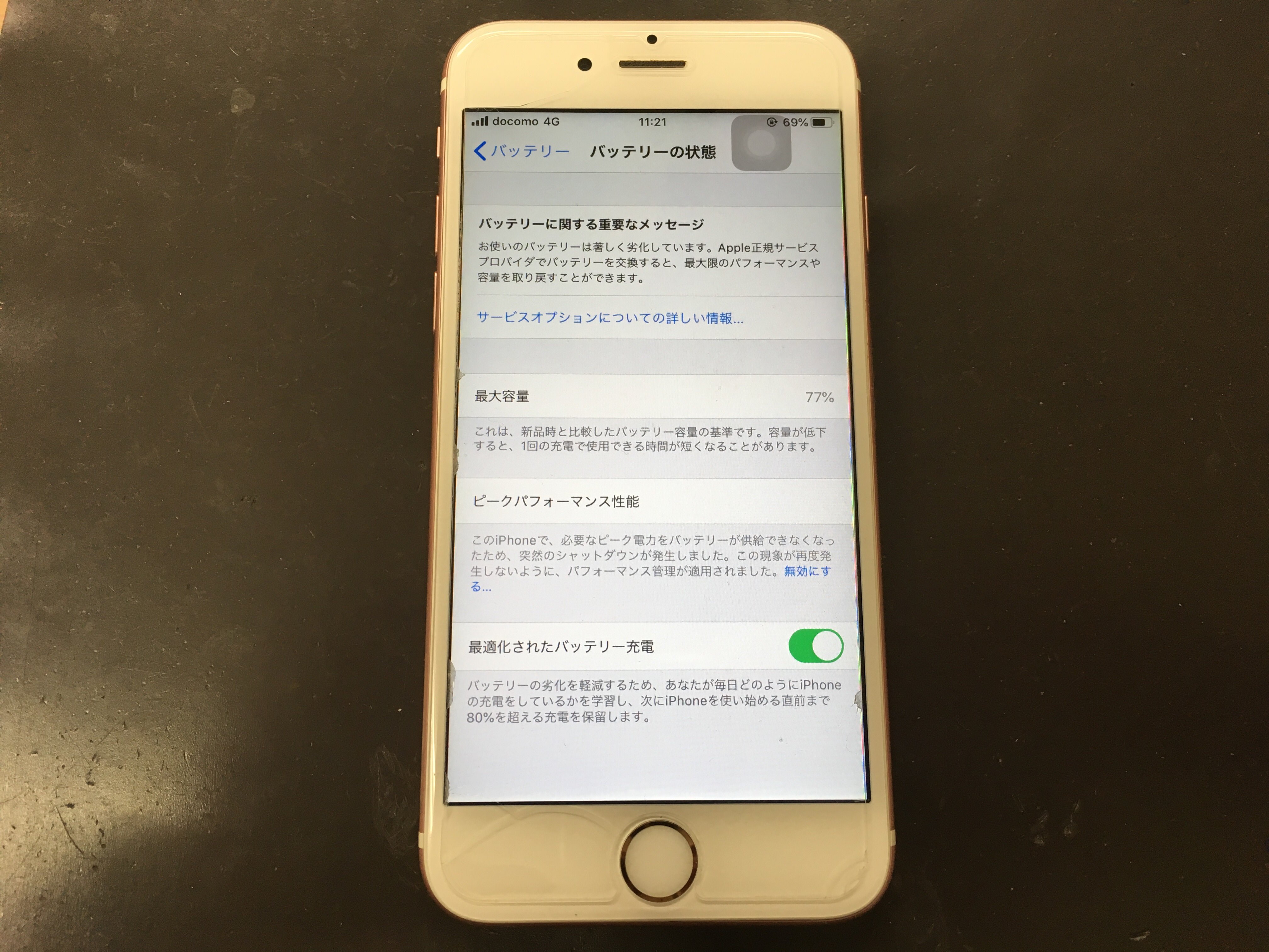 最大容量を確認すると77%となっており、バッテリーに関する重要なメッセージが表示されておりました。