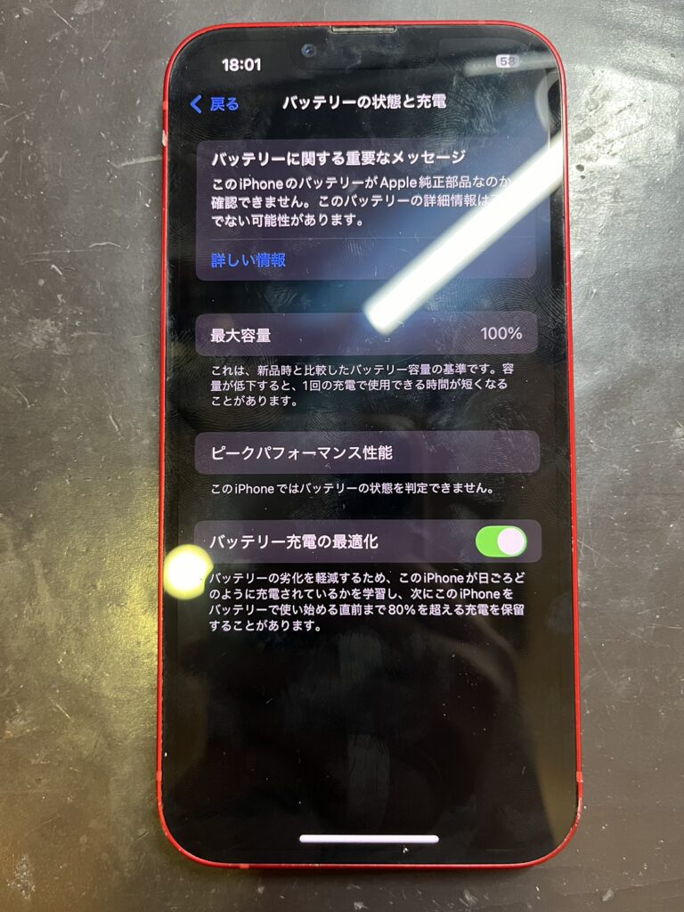 バッテリー最大容量サービス表記となる77%だったため、バッテリー交換修理を行いました!