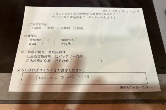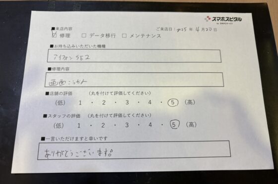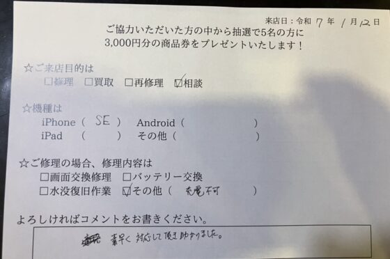 iPhoneSEの充電不可の相談に来られたお客様からお声を頂きました。
