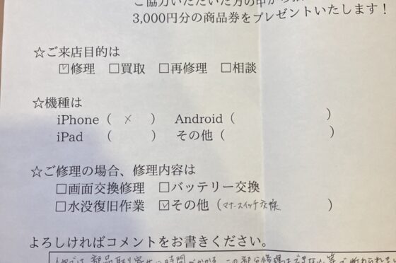 iPhoneXマナースイッチ交換でご来店されたお客様からお声を頂きました
