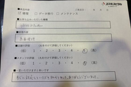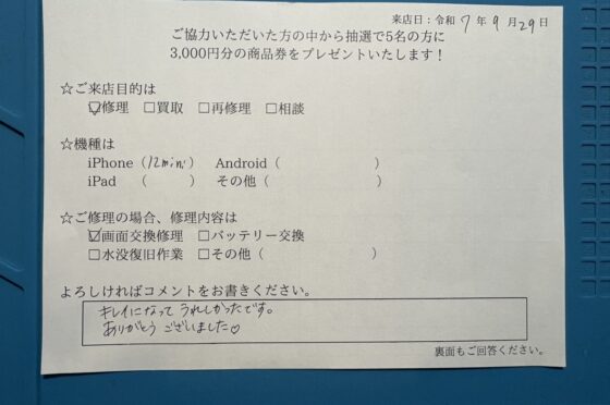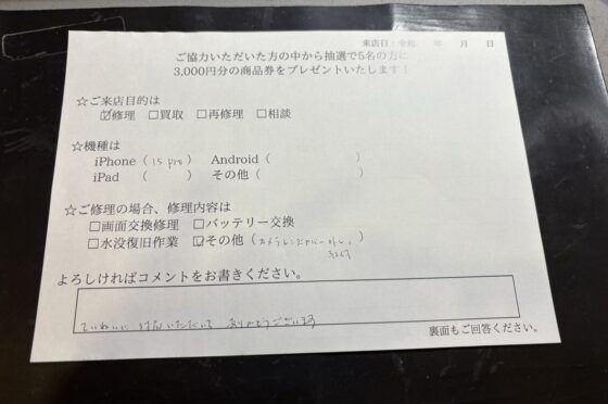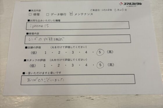 iPhone15のメンテナンスをご対応させていただたお客様からお声をいただきました!