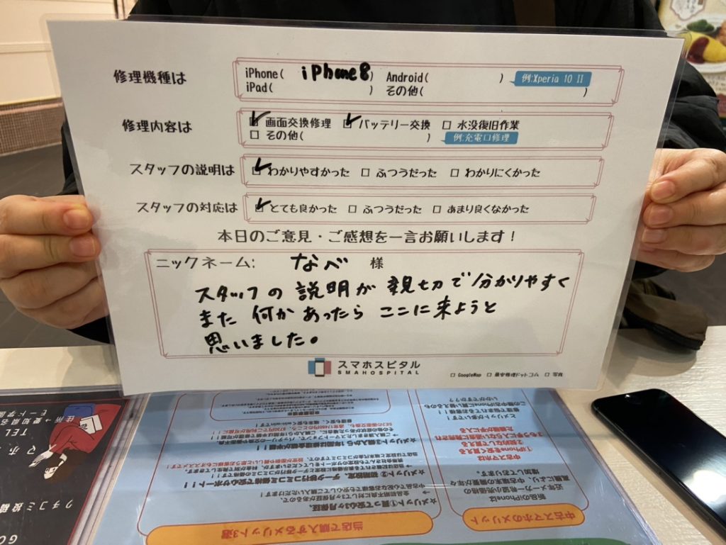 スマホスピタル名古屋駅前 iPhone8 液晶画面&バッテリー交換でお客様の声をいただきました!
