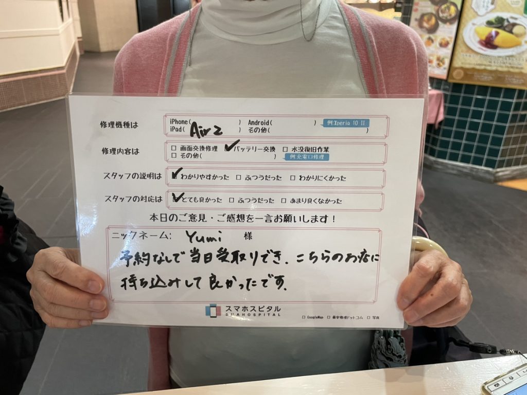 スマホスピタル名古屋駅前 iPad Air2 バッテリー交換修理でお客様の声をいただきました!